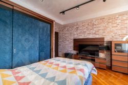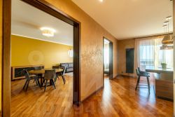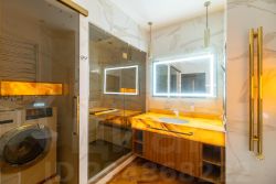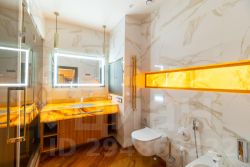 В квартире два санузла: один гостевой, другой, помимо необходимой сантехники, оснащен паровой сауной. Пол из влагоустойчивого дерева с подогревом.