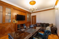Одна из комнат оформлена под кабинет: вся мебель изготовлена на заказ из дуба, в шкафу есть вместительный сейф.