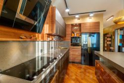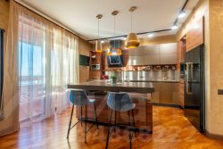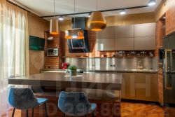 Кухня оснащена самой современной техникой европейских производителей Kuppersbusch и Liebherr: два холодильника, посудомоечная машина, духовой шкаф с функцией пароварки, варочная индукционная панель, кофемашина. Мебель на кухне от австрийского производителя Team 7. Изюминкой является большой стол-остров, оснащенный механизмом автоматической регулировки высоты.