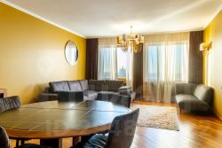 В квартире две просторные спальни, кабинет, кухня-гостиная и три лоджии с шикарным видом на Неву, Смольный собор и центр города. Все окна и балконные двери изготовлены из дуба с тройным стеклопакетом, а пол - из тикового дерева.