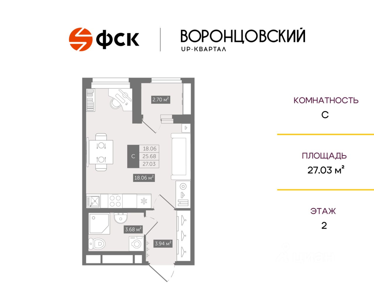 Цена со скидкой до 30% в прямой продаже от застройщика — только в этом месяце. Беспроцентная рассрочка. Студия в ЖК Квартал "Воронцовский" на 2-м этаже. Общая площадь 27,03. Чистовая отделка.