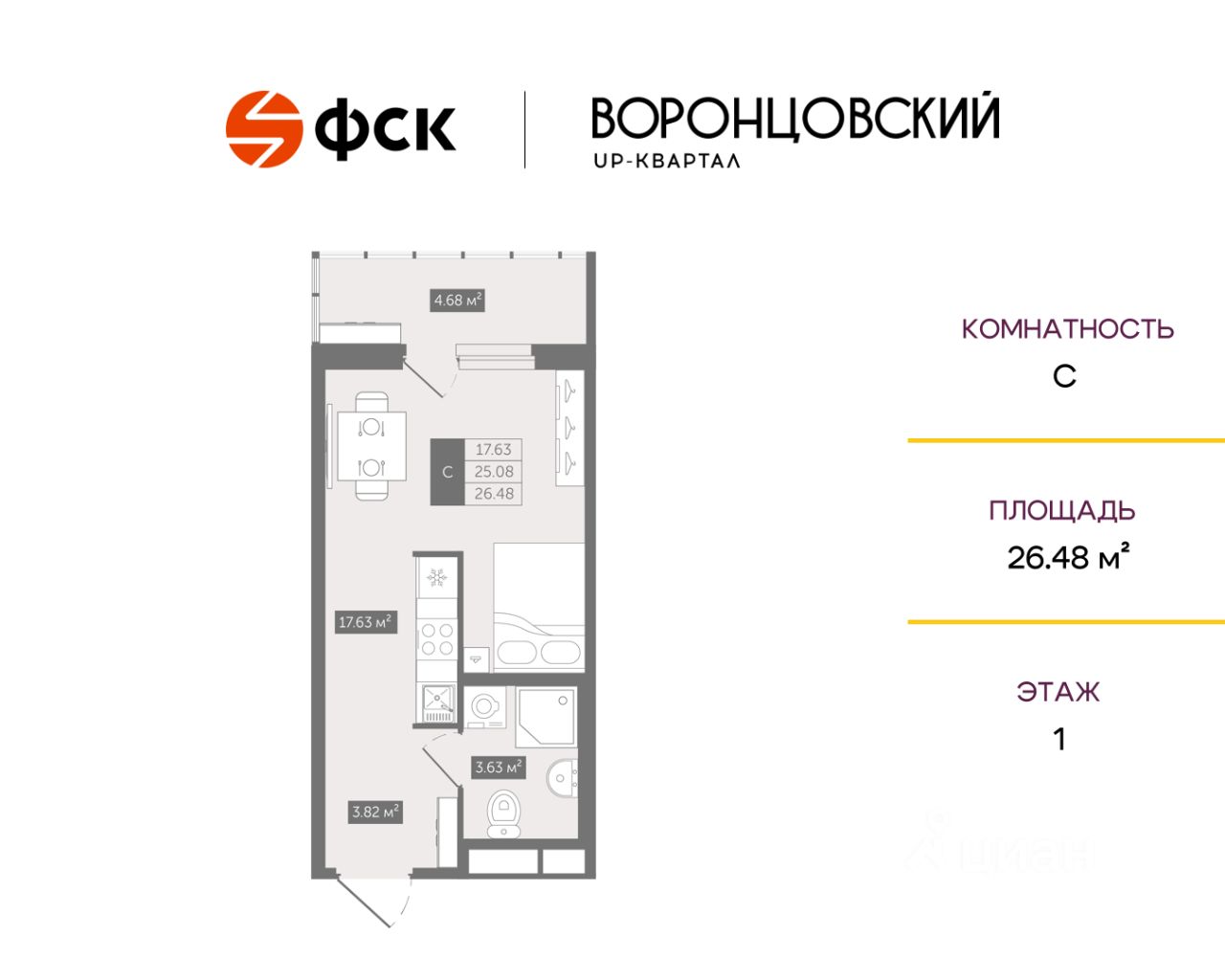 Цена со скидкой до 30% в прямой продаже от застройщика — только в этом месяце. Беспроцентная рассрочка. Студия в ЖК квартал "Воронцовский" на 1-м этаже. Общая площадь 26,48. Чистовая отделка.
