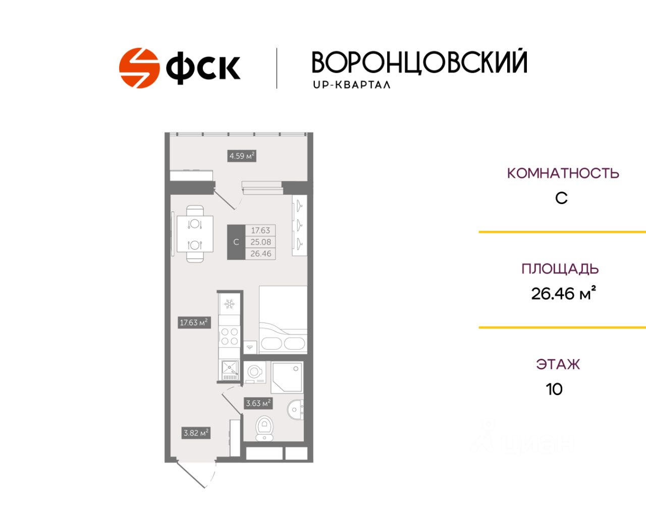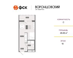 Цена со скидкой до 30% в прямой продаже от застройщика — только в этом месяце. Беспроцентная рассрочка. Студия в ЖК Квартал "Воронцовский" на 10-м этаже. Общая площадь 26,46. Чистовая отделка.