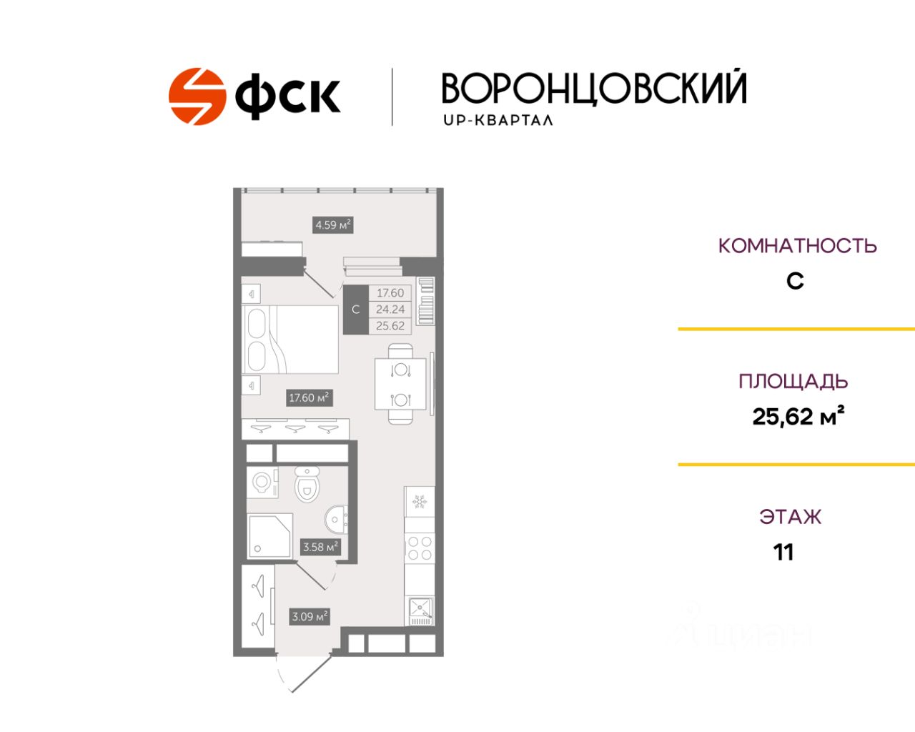 Цена со скидкой до 30% в прямой продаже от застройщика — только в этом месяце. Беспроцентная рассрочка. Студия в ЖК UP-квартал "Воронцовский" на 11-м этаже. Общая площадь 25,62. Чистовая отделка.