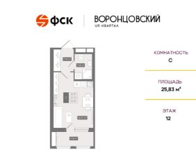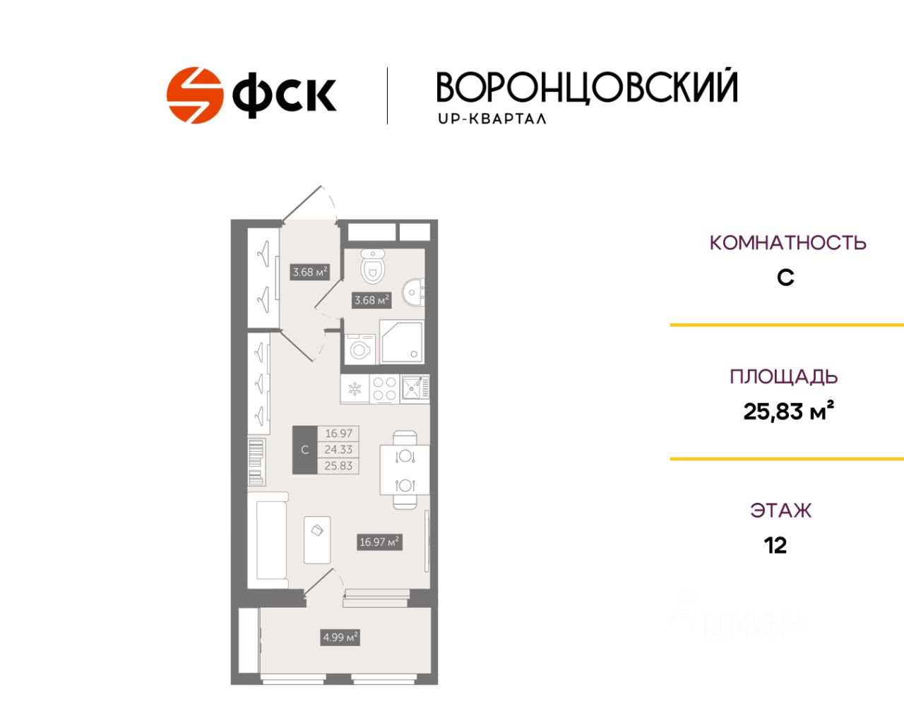 Цена со скидкой до 30% в прямой продаже от застройщика — только в этом месяце. Беспроцентная рассрочка. Студия в ЖК UP-квартал "Воронцовский" на 12-м этаже. Общая площадь 25,83. Чистовая отделка.