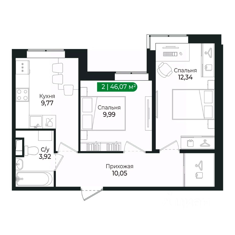 Напрямую продаётся уютная 2-комнатная квартира 38 общей площадью 46,07 м2 во II очереди в жилом комплексе Сертолово Парк от застройщика ГК Алгоритм.