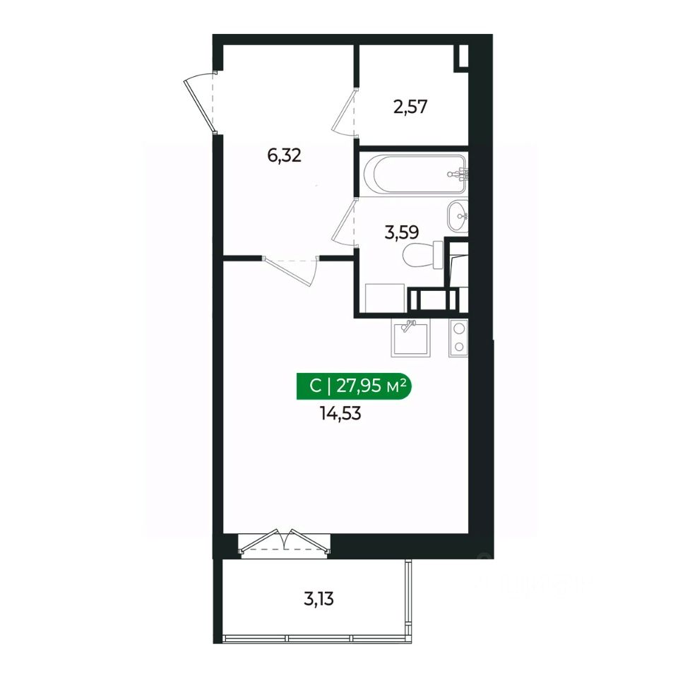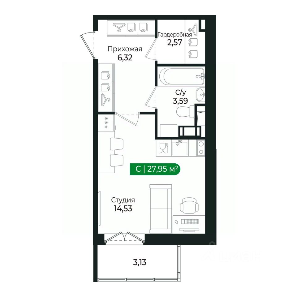 Напрямую продаётся уютная студия 129 общей площадью 27,95 м2 во II очереди в жилом комплексе Сертолово Парк от застройщика ГК Алгоритм.