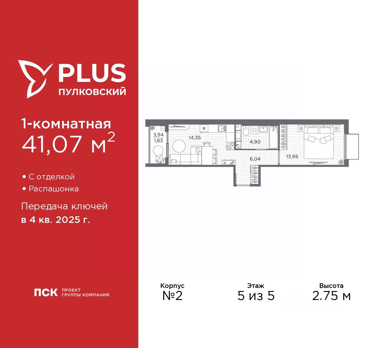 1-комн. квартира с отделкой в ЖК "PLUS Пулковский" на 5 этаже. Общая площадь: 41.07 кв.м., жилая: 13.95 кв.м., площадь просторной кухни-столовой: 14.35 кв.м. Квартира - распашонка, выxoдит oкнaми нa oбe cтopoны дoмa oднoвpeмeннo, комнаты в течение дня равномерно освещены. В квартире один балкон, один совмещенный санузел. Высота потолков 2.75 м.