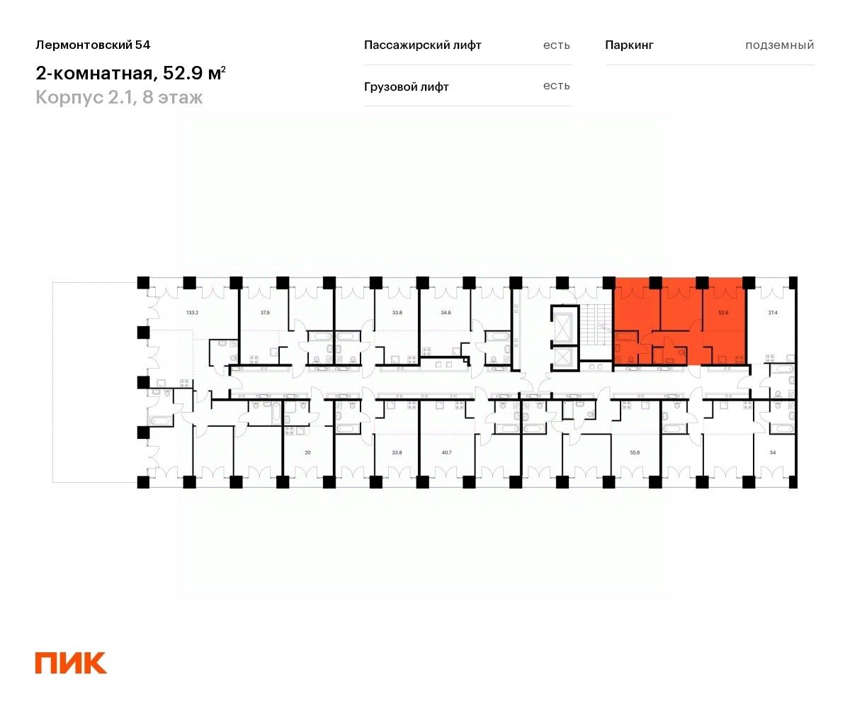 Продаётся 2-комн. квартира площадью 52,9 кв.м на 8 этаже 9 этажного дома (Корпус 2.1, Секция 6) проекта ПИК Лермонтовский 54. Светлый просторный подъезд на уровне земли, функциональная планировка, большие окна, без отделки.