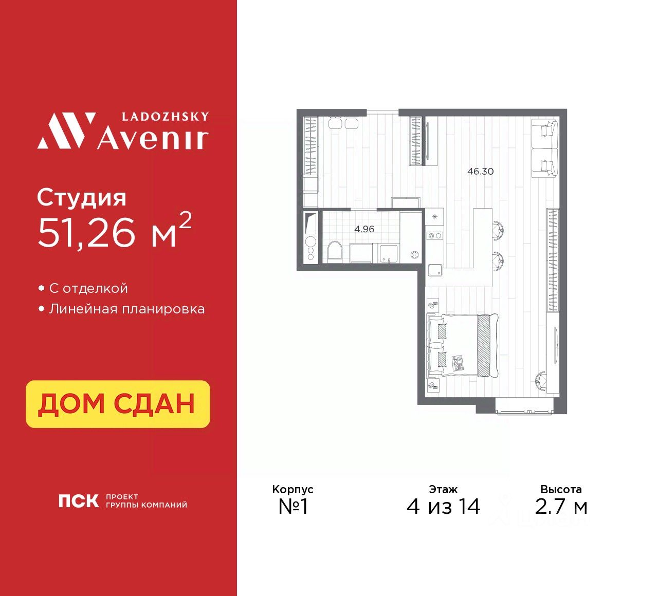 1-комн. апартаменты-студия с отделкой в ЖК "Ladozhsky AVENIR" на 4 этаже. Общая площадь: 51.26 кв.м., площадь гостиной 46.3 кв.м., из которых 10 кв.м. выделено под кухонную зону. Все окна выходят на одну сторону. В апартаментах один совмещенный санузел. Высота потолков 2.7 м.
