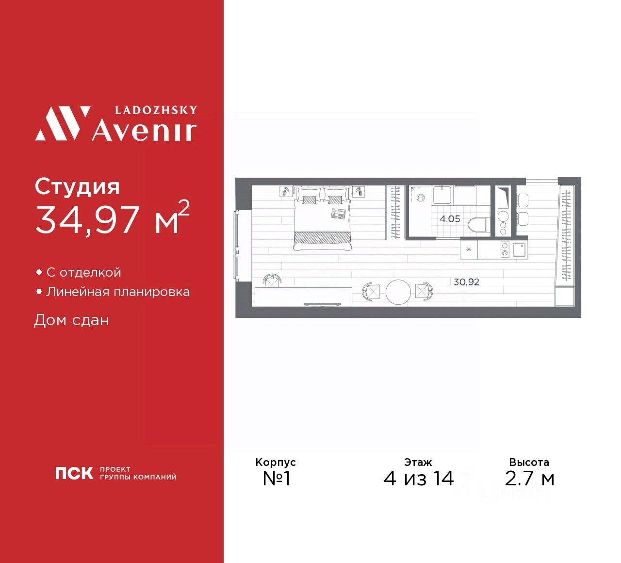 Однокомнатные апартаменты-студия с отделкой в ЖК "Ladozhsky AVENIR" на 4 этаже. Общая площадь: 34.97 кв.м., площадь гостиной 30.92 кв.м., из которых 5 кв.м. выделено под кухонную зону. Все окна выходят на одну сторону. В апартаментах один совмещенный санузел. Высота потолков 2.7 м.