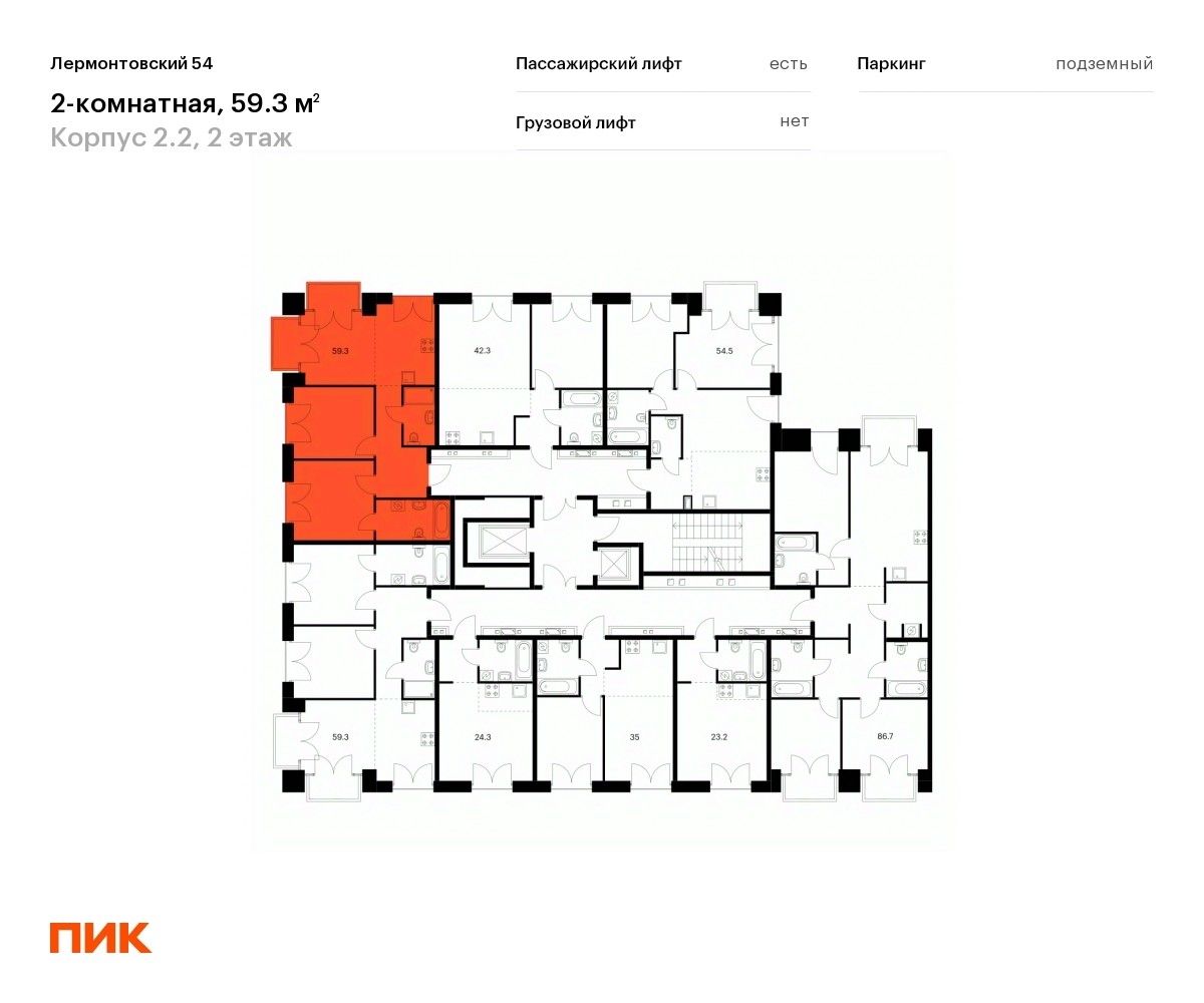 Продаётся 2-комн. квартира площадью 59,3 кв.м на 2 этаже 7 этажного дома (Корпус 2.2, Секция 14) проекта ПИК Лермонтовский 54. Светлый просторный подъезд на уровне земли, функциональная планировка, большие окна, без отделки.