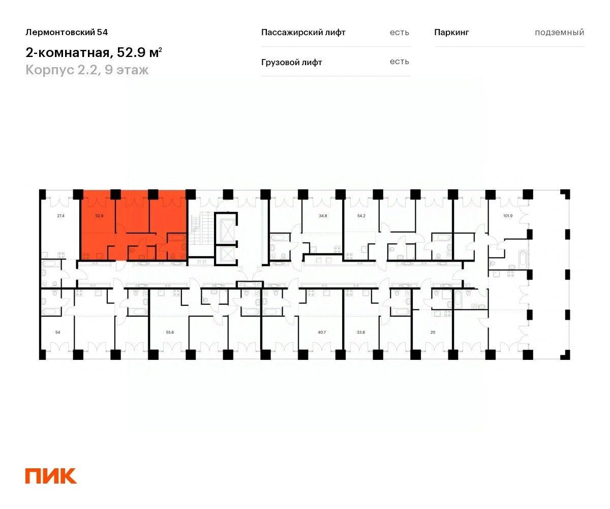Продаётся 2-комн. квартира площадью 52,9 кв.м на 9 этаже 9 этажного дома (Корпус 2.2, Секция 9) проекта ПИК Лермонтовский 54. Светлый просторный подъезд на уровне земли, функциональная планировка, большие окна, без отделки.