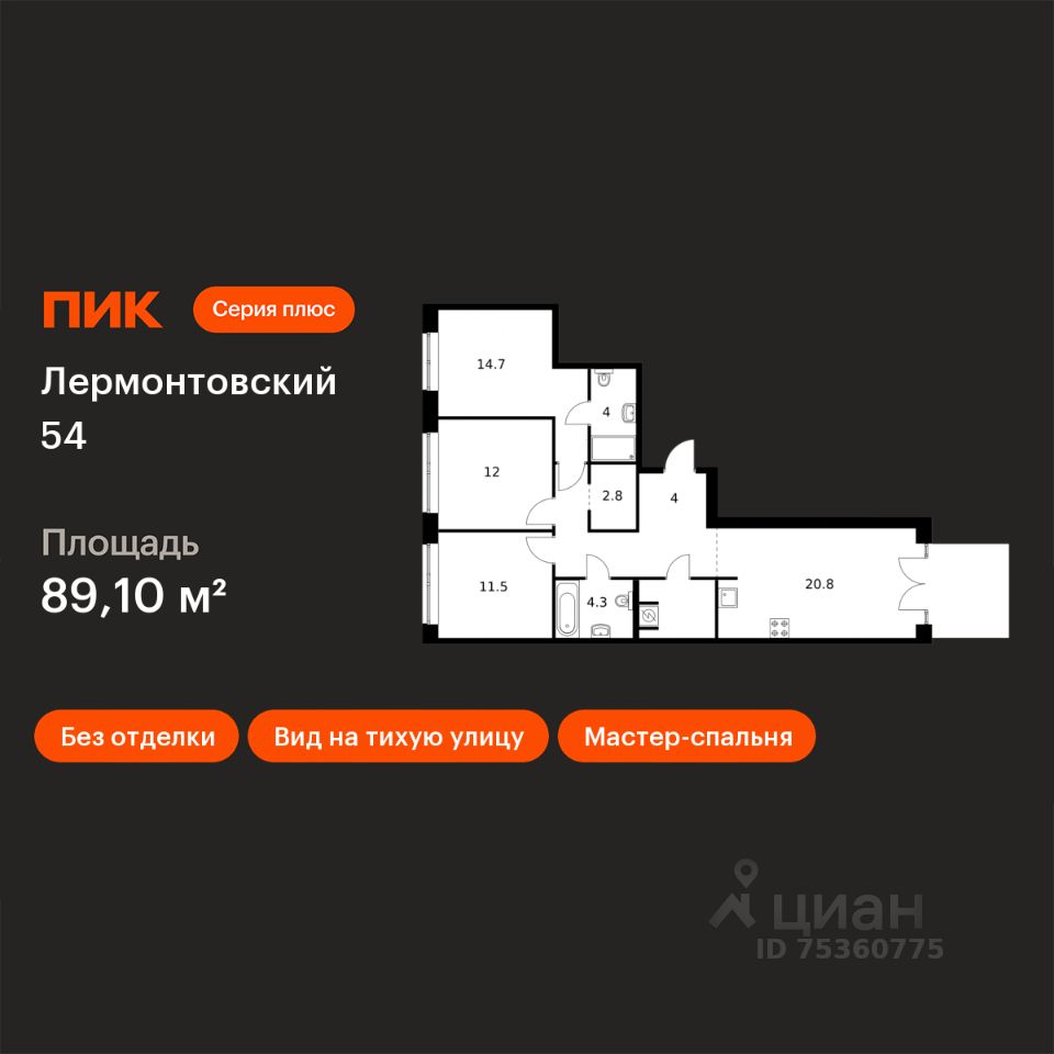 Продаётся 3-комн. квартира площадью 89,1 кв.м на 1 этаже 7 этажного дома (Корпус 2.1, Секция 7) проекта ПИК Лермонтовский 54. Светлый просторный подъезд на уровне земли, функциональная планировка, большие окна, без отделки.