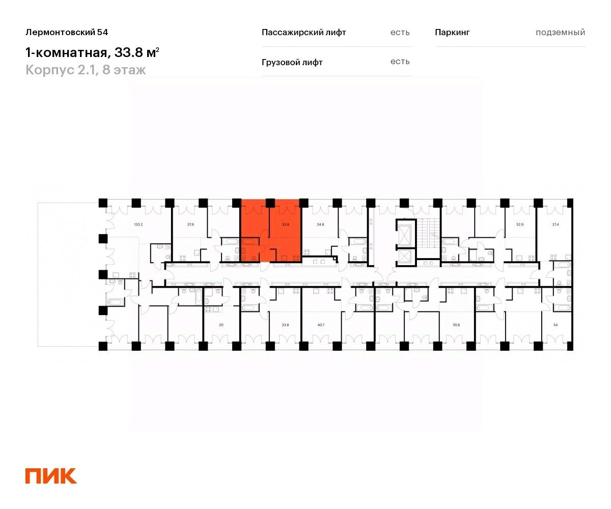 Продаётся 1-комн. квартира площадью 33,8 кв.м на 8 этаже 9 этажного дома (Корпус 2.1, Секция 6) проекта ПИК Лермонтовский 54. Светлый просторный подъезд на уровне земли, функциональная планировка, большие окна, без отделки.