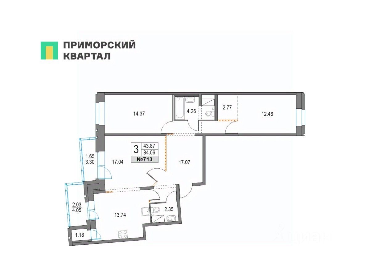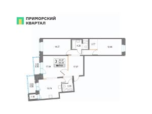 Продается 3 - комнатная квартира общей площадью 84.06 кв.м., на 9 этаже в построенном и заселенном корпусе 41 (год сдачи: 2024 г.)