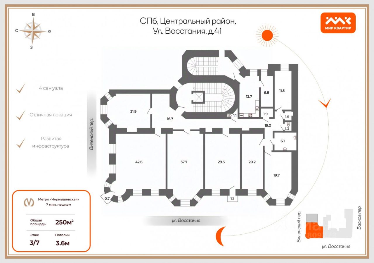 Квартира выходит окнами на Виленский переулок и ул. Восстания В центральном районе много престижных школ, муниципальные и частные детские сады. Максимально развитая транспортная инфраструктура. Рядом с домом аптека 24 часа, универсамы и рестораны на любой вкус.