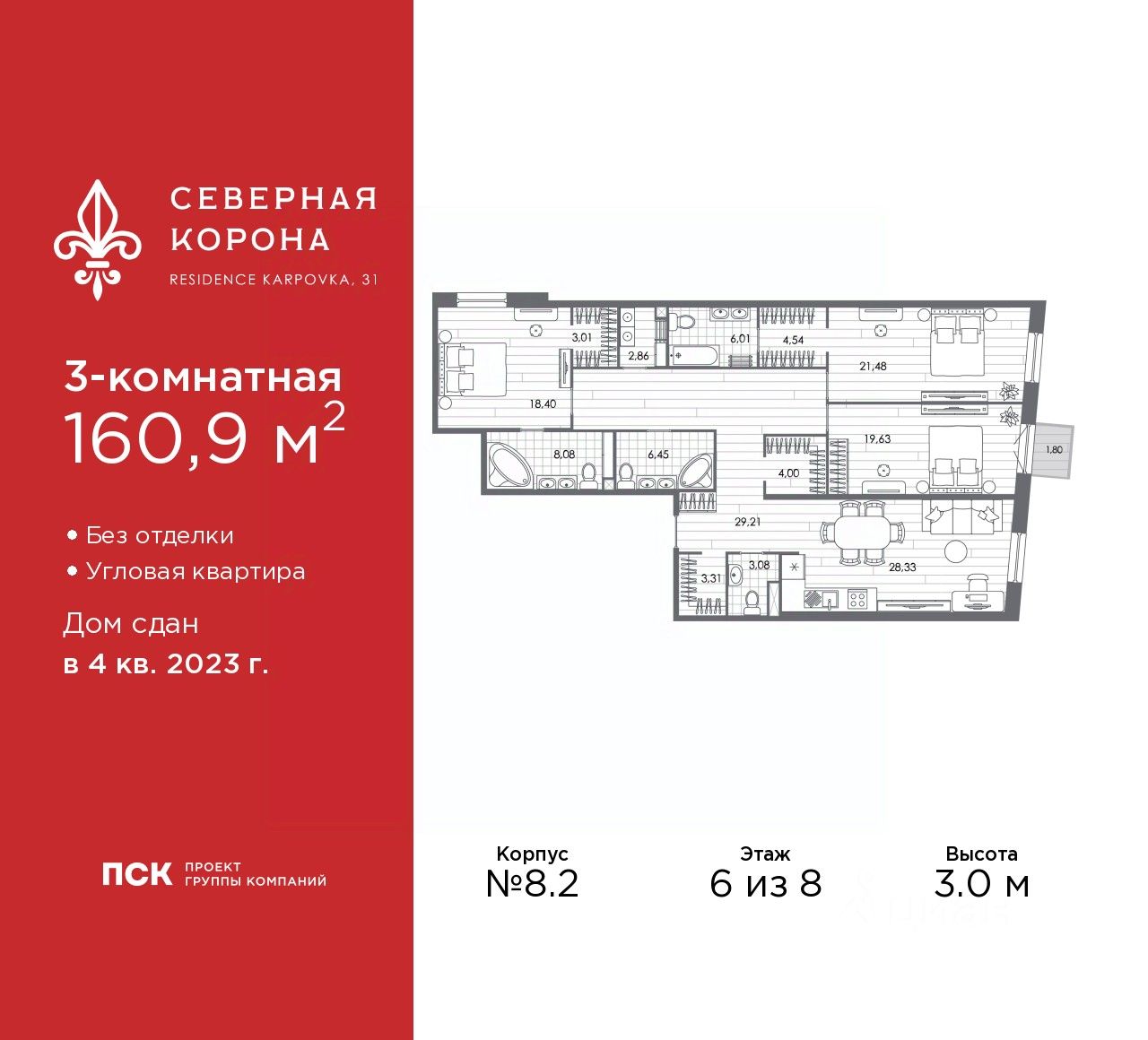 Продается 3-комн. квартира в ЖК "Северная корона" на 6 этаже. Квартира без отделки, новый владелец может сделать ремонт по своему дизайн-проекту. Общая площадь: 160.9 кв.м., жилая: 59.51 кв.м., площадь просторной кухни-столовой: 29.33 кв.м. Угловая квартира, идеально подойдет любителям тишины и панорамных видов. В квартире один балкон, три совмещенных и один раздельный санузел. Высота потолков 3.0 м.