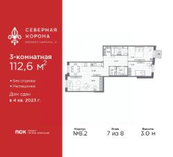 3-комн. квартира в ЖК "Северная корона" на 7 этаже. Квартира без отделки, полностью готова к чистовой отделке и дальнейшему ремонту. Общая площадь: 112.6 кв.м., жилая: 58.79 кв.м., площадь просторной кухни-столовой: 21.48 кв.м. Квартира - распашонка, без проходных комнат, окна выходят на paзные стороны дома. В квартире один балкон, два совмещенных и один раздельный санузел. Высота потолков 3.0 м.