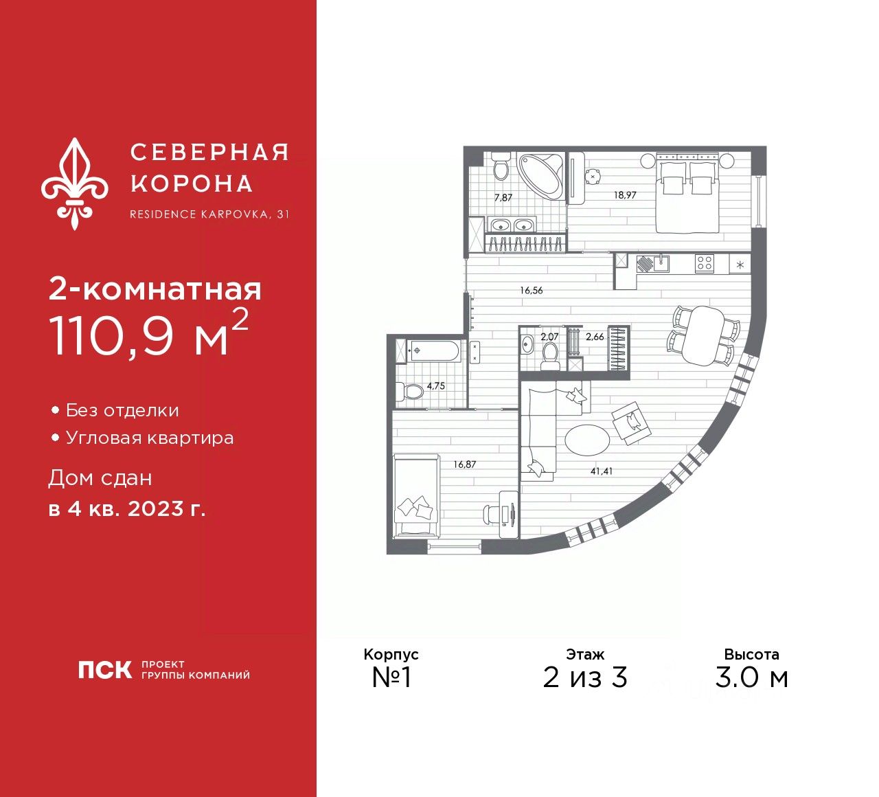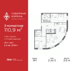 Просторная 2-комн. квартира в ЖК "Северная корона" на 2 этаже. Квартира без отделки, полностью готова к чистовой отделке и дальнейшему ремонту. Общая площадь: 110.9 кв.м., жилая: 35.84 кв.м., площадь просторной кухни-столовой: 41.41 кв.м. Угловая квартира, очень светлая, естественная вентиляция при открытии окон. В квартире два совмещенных и один раздельный санузел. Высота потолков 3.0 м.