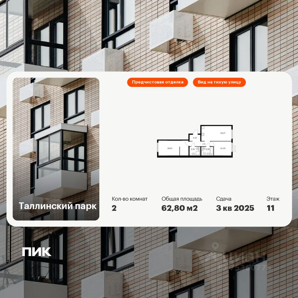 Продаётся 2-комн. квартира площадью 62,8 кв.м на 11 этаже 12 этажного дома (Корпус 3.1, Секция 3) проекта ПИК Таллинский парк. Светлый просторный подъезд на уровне земли, функциональная планировка, большие окна, предчистовая отделка.