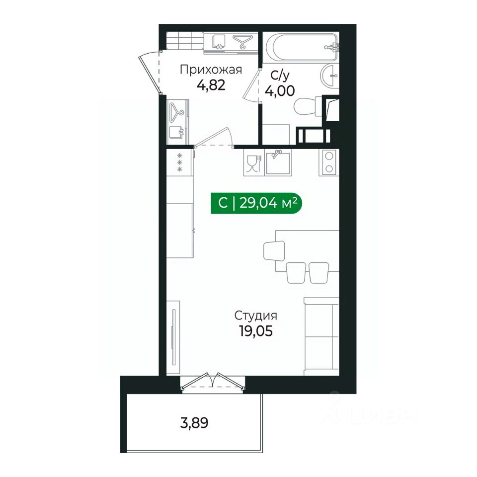 Система хранения располагается в прихожей, а кухня и спальное место объединены в одно помещение.