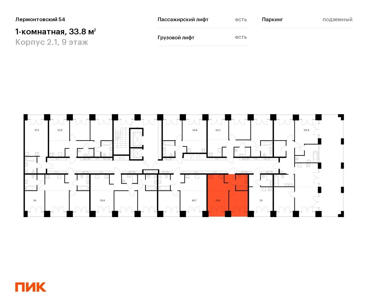 Продаётся 1-комн. квартира площадью 33,8 кв.м на 9 этаже 9 этажного дома (Корпус 2.1, Секция 2) проекта ПИК Лермонтовский 54. Светлый просторный подъезд на уровне земли, функциональная планировка, большие окна, без отделки.