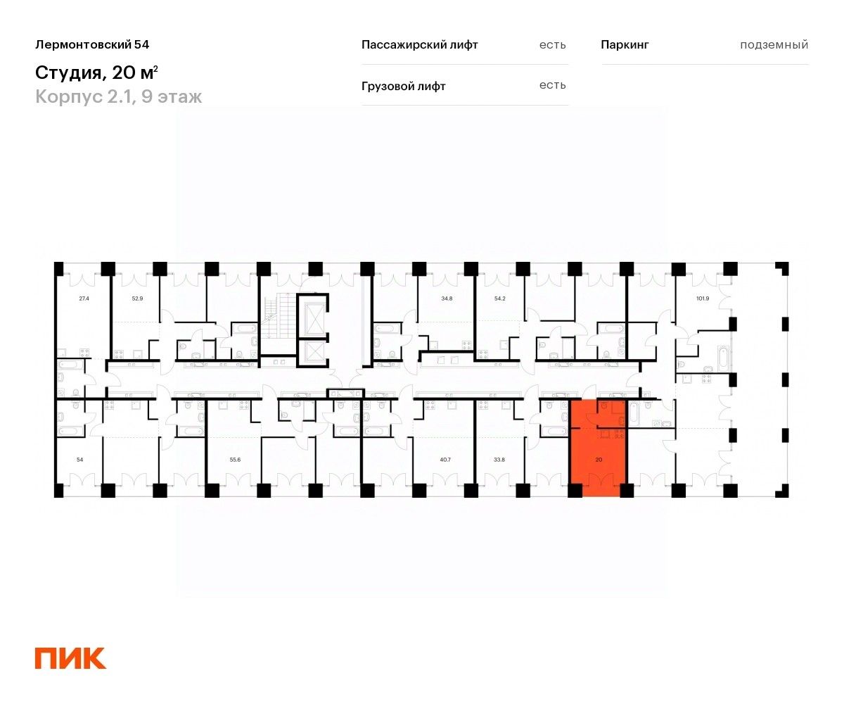 Продаётся квартира-студия площадью 20 кв.м на 9 этаже 9 этажного дома (Корпус 2.1, Секция 2) проекта ПИК Лермонтовский 54. Светлый просторный подъезд на уровне земли, функциональная планировка, большие окна, без отделки.