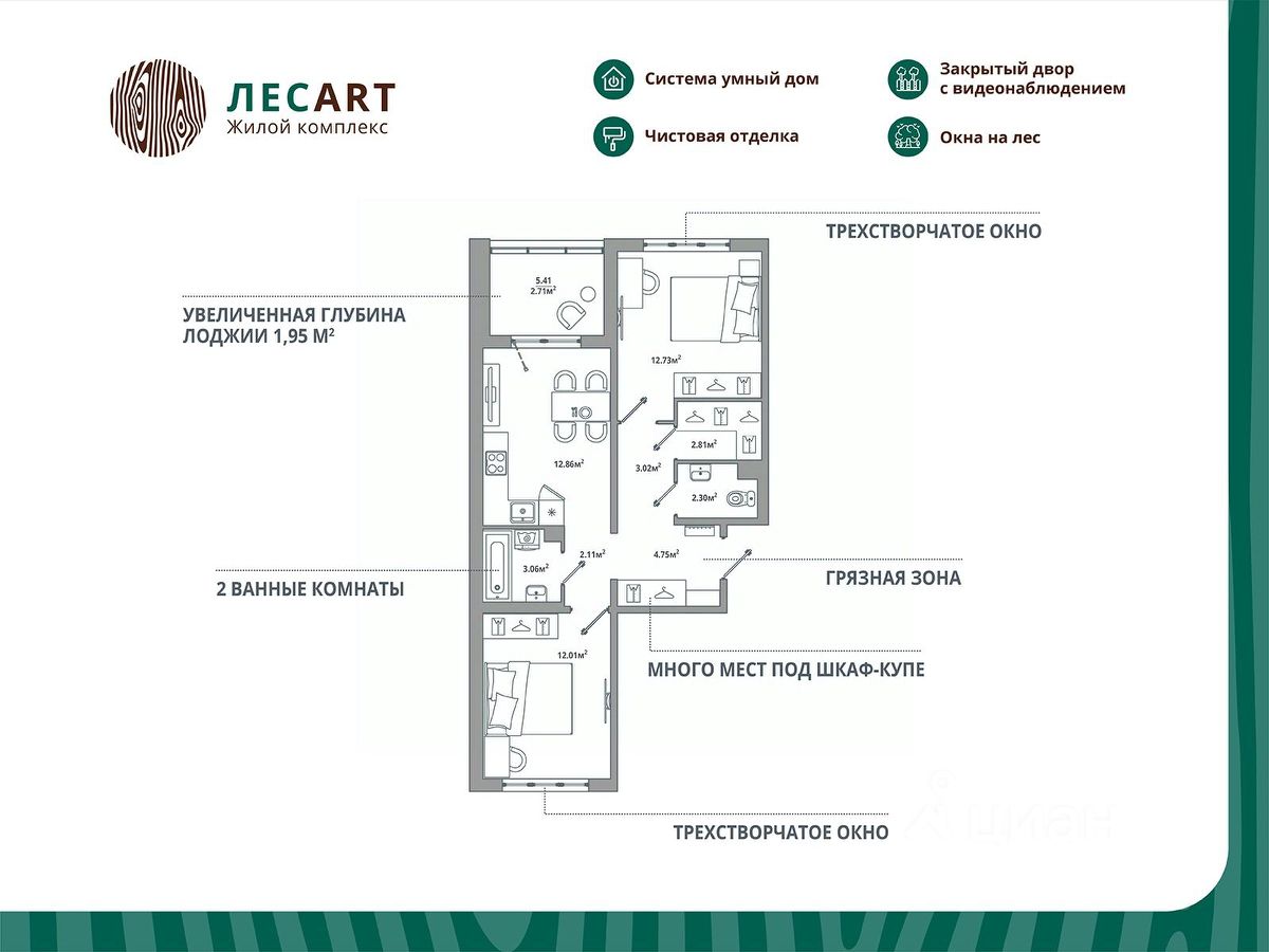 Продаётся 2-комнатная квартира 104, общей площадью 58.36 кв.м., на 2. Дом комфорт-класса, 12 этажей, в окружении леса и малоэтажной застройки. Проект с умным домом. Передача квартир в апреле 2026г.
