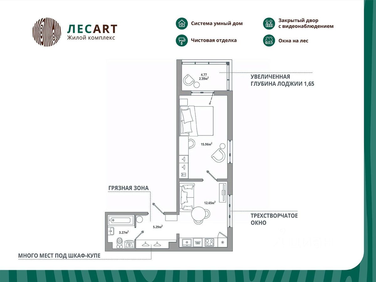 Продаётся 1-комнатная квартира 117, общей площадью 39.56 кв.м., на 4. Дом комфорт-класса, 12 этажей, в окружении леса и малоэтажной застройки. Проект с умным домом. Передача квартир в апреле 2026г.