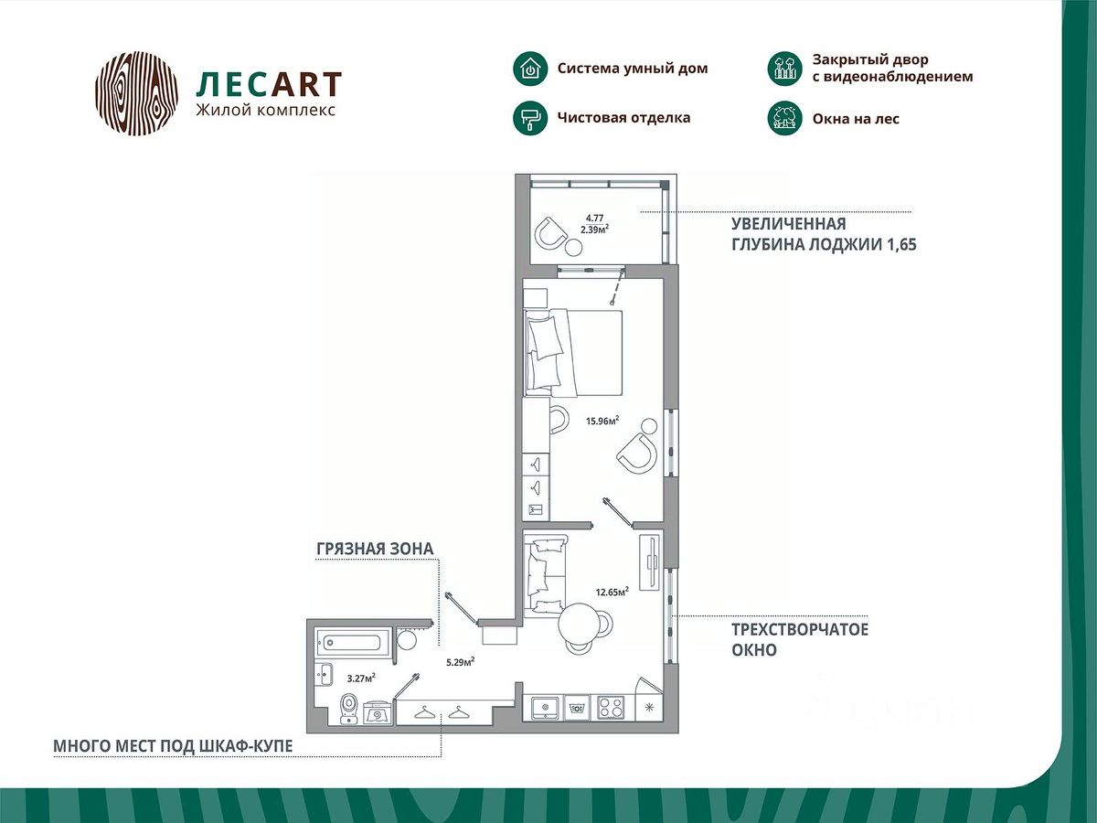 Продаётся 1-комнатная квартира 138, общей площадью 39.56 кв.м., на 11. Дом комфорт-класса, 12 этажей, в окружении леса и малоэтажной застройки. Проект с умным домом. Передача квартир в апреле 2026г.