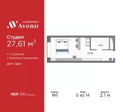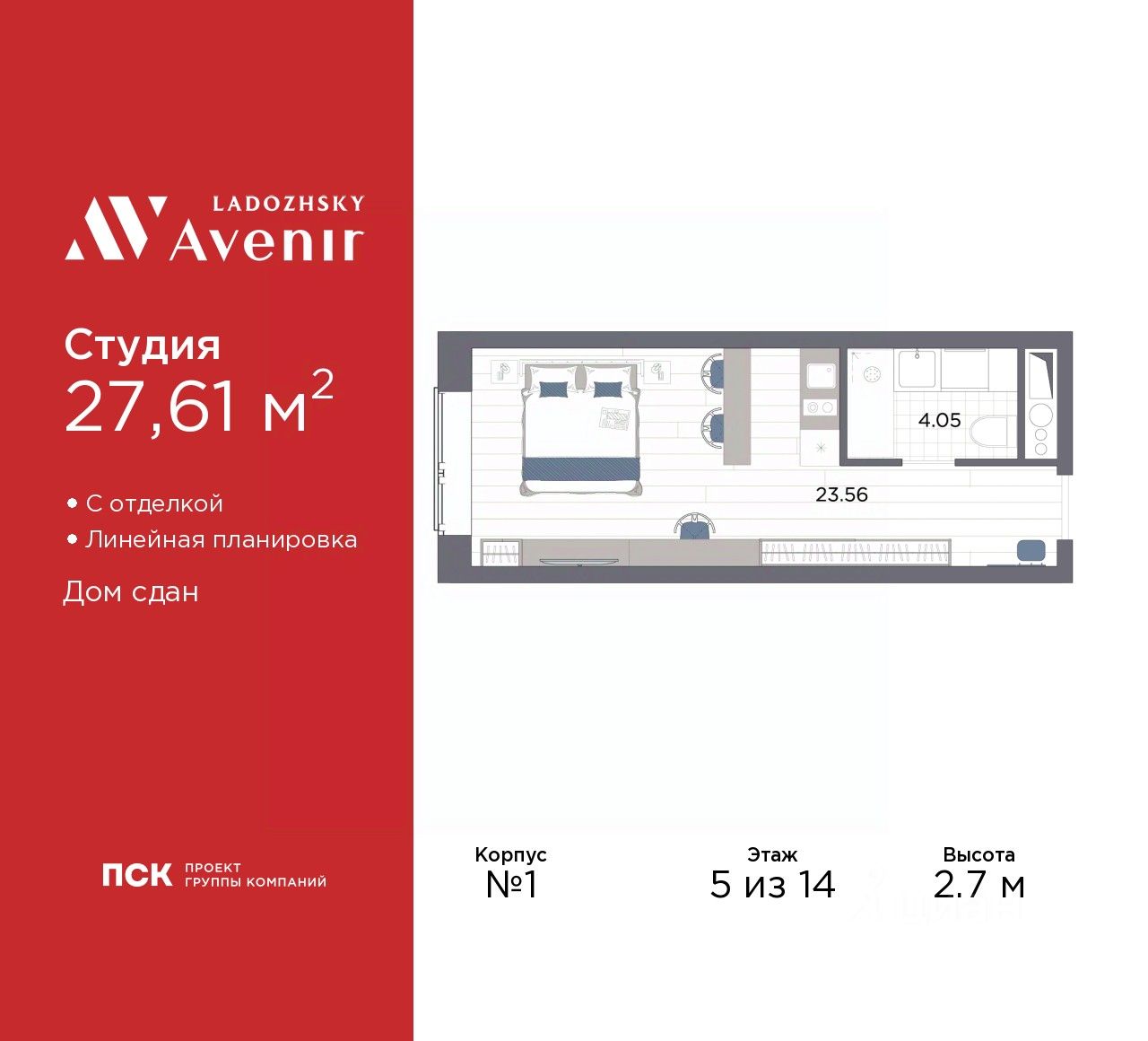 Однокомнатные апартаменты-студия с отделкой в ЖК "Ladozhsky AVENIR" на 5 этаже. Общая площадь: 27.61 кв.м., площадь гостиной 23.56 кв.м., из которых 5 кв.м. выделено под кухонную зону. Все окна выходят на одну сторону. В апартаментах один совмещенный санузел. Высота потолков 2.7 м.