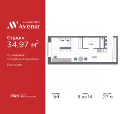 1-комн. апартаменты-студия от застройщика с отделкой в ЖК "Ladozhsky AVENIR" на 5 этаже. Общая площадь: 34.97 кв.м., площадь гостиной 30.92 кв.м., из которых 5 кв.м. выделено под кухонную зону. Все окна выходят на одну сторону. В апартаментах один совмещенный санузел. Высота потолков 2.7 м.