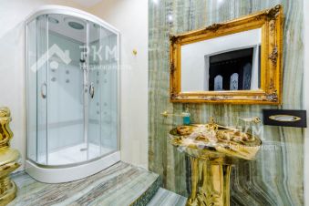 - Общая площадь квартиры 311 м2, планировка включает: кухню - столовую 45,4 м2, гостиную 84,6 м2, спальни 31,2 м2 и 20,4 м2; комнату 55,6 м2, кабинет 34,2 м2, прихожая 9,3 м2, холл 18,2 м2, два совмещенных санузла: с ванной и душевой кабиной;
