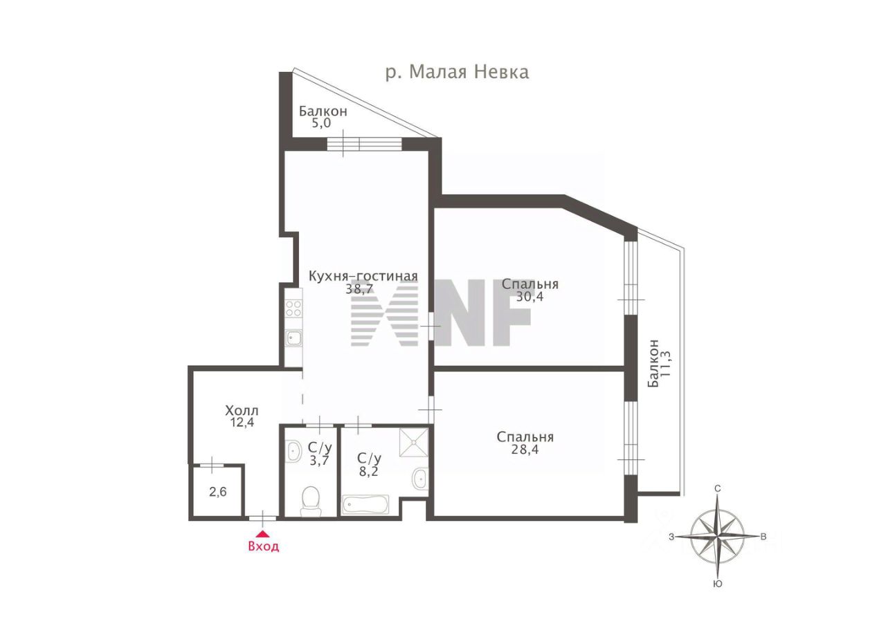 Лот: 79063. Предлагается к приобретению трехкомнатная квартира на 10-м этаже общей площадью 124,4 кв. м с боковым видом на Малую Невку в элитном клубном доме "Мальта" жилого комплекса "Леонтьевский мыс". Квартира со свободной планировкой, включает в себя кухню-гостиную площадью 38,4 кв. м и две спальни с общим балконом.