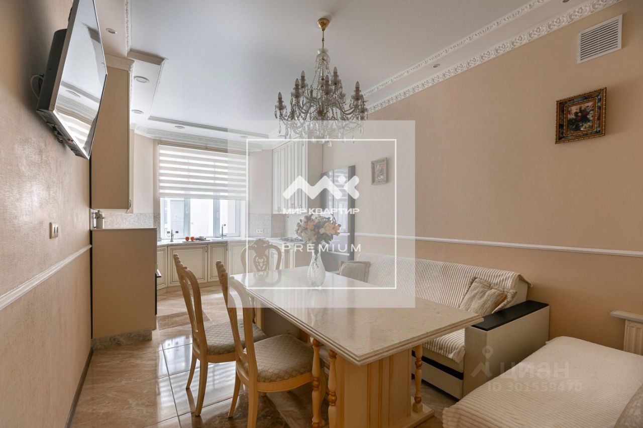 Квартира общей площадью 123,8 кв/м, расположена на третьем этаже. Есть лифт. Грамотная планировка - просторная кухня-столовая, 4 отдельные комнаты, гостиная, 2 санузла. Высокие потолки 3.20 м. Теплый пол во всей квартире. Ремонт выполнен из высококачественных материалов, с использованием массива натурального дерева. Вся мебель и бытовая техника остаются новым жильцам. Окна во двор, что обеспечивает тишину в квартире и отсутствие постороннего шума. Есть возможность использования второго входа/выхода. Парковка во дворе - мест много, въезд во двор через ворота по пульту только для жильцов дома.
