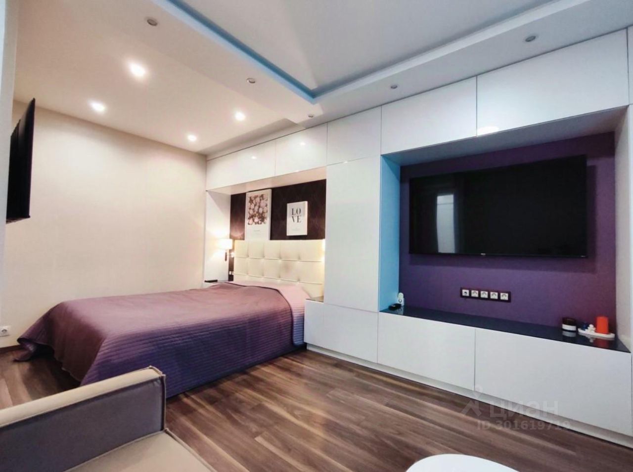 Комната с разделением зон, кровать со встроенными верхними шкафами и прикроватными тумбочками являются очень похвальным решением. Отдельная зона для кровати и отдельно выполнена зона самой гостиной с мягким диваном. Можно впихнуть не впихуемое, везде есть место для хранения.