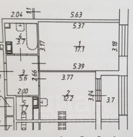 Площадь комнаты-17.1м, кухня-12.2м, ванная-3.7м, санузел-1.7м, коридор-5.6м, лоджия-3.7м.