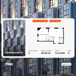 Продаётся 2-комн. квартира площадью 65,6 кв.м на 8 этаже 12 этажного дома (Корпус 1, Секция 8) проекта ПИК Шкиперский 19. Светлый просторный подъезд на уровне земли, функциональная планировка, большие окна, предчистовая отделка.