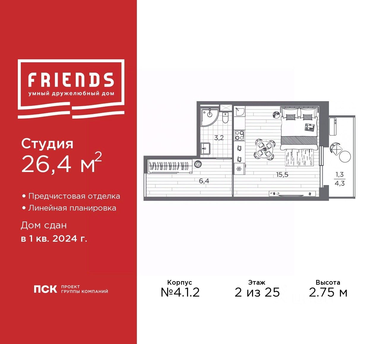 Просторная однокомнатная квартира-студия с предчистовой отделкой в ЖК "Friends" на 2 этаже. Общая площадь: 26.4 кв.м., площадь гостиной 15.2 кв.м., из которых 5 кв.м. выделено под кухонную зону. Все окна выходят на одну сторону. В квартире один балкон, один совмещенный санузел. Высота потолков 2.75 м.