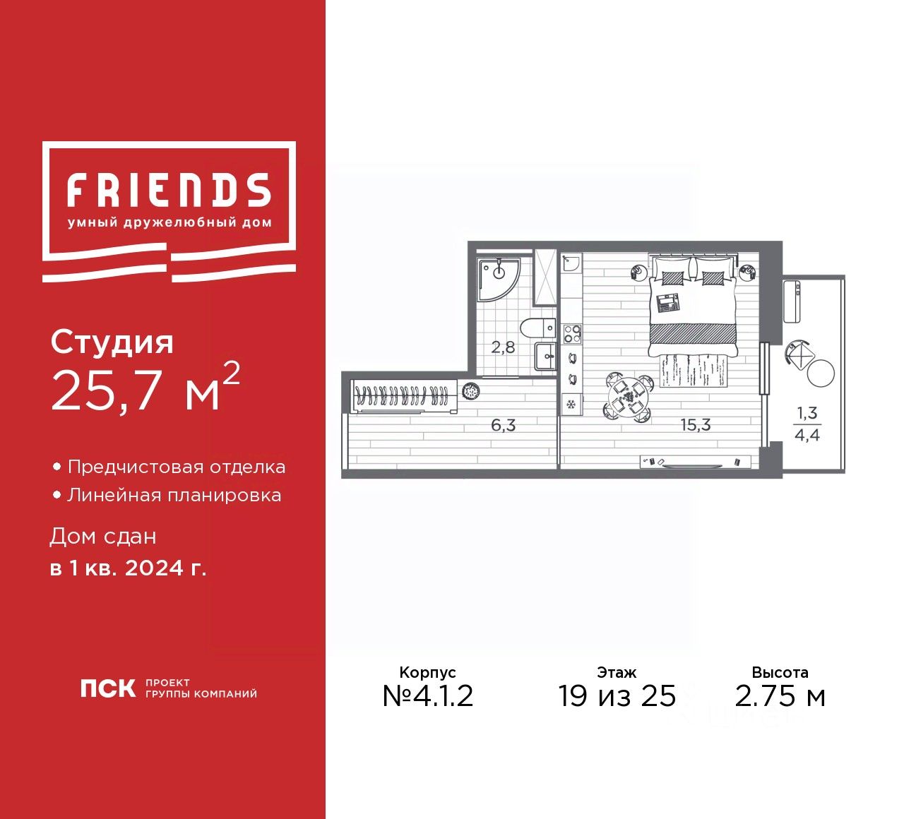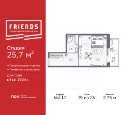 Просторная однокомнатная квартира-студия с предчистовой отделкой в ЖК "Friends" на 19 этаже. Общая площадь: 25.7 кв.м., площадь гостиной 15.2 кв.м., из которых 5 кв.м. выделено под кухонную зону. Все окна выходят на одну сторону. В квартире один балкон, один совмещенный санузел. Высота потолков 2.75 м.