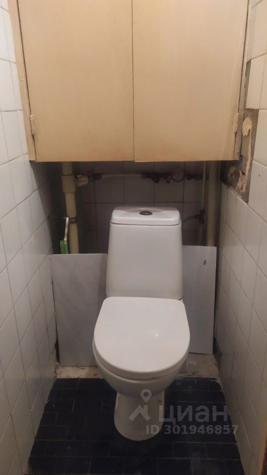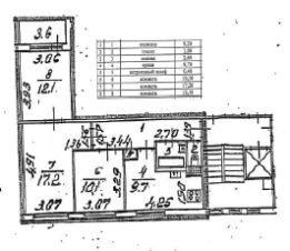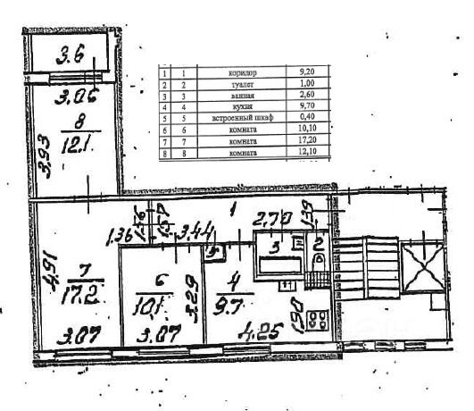 При входе в квартиру расположены туалет, ванная, а чуть далее вход в кухню. Сохранён встроенный шкаф рядом с кухней (5 на плане) и антресоли в коридоре и на кухне. Далее по коридору вход в комнаты 7 (17,2 кв.м.) и 8 (12,1 кв.м.) плана и дверь в комнату 6 (10,1 кв.м.). В данной комнате осуществлён косметический ремонт, заменена батарея и установлено пластиковое окно. При входе в комнату 7 смонтирован встроенный шкаф/кладовка. Из комнаты 8 плана расположен выход на лоджию (последняя фотография 3,6 кв.м.).