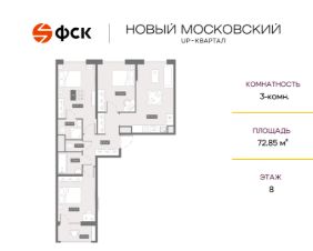 Цена со скидкой до 30% в прямой продаже от застройщика — только в этом месяце. Беспроцентная рассрочка. 3-к квартира в ЖК Up-квартал "Новый Московский" на 8-м этаже. Общая площадь 72,85. Без отделки.