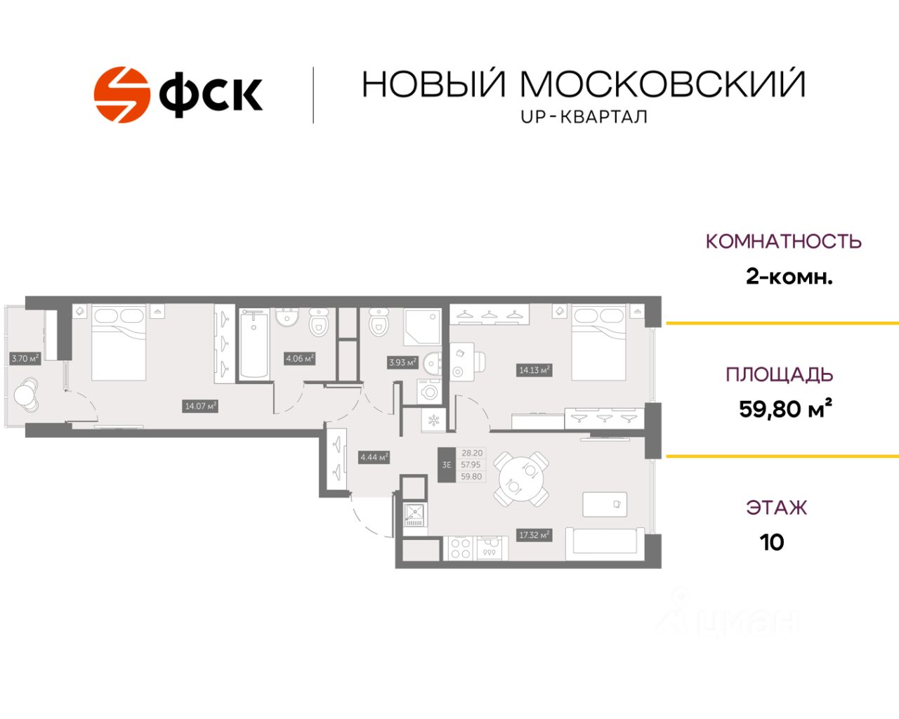 Цена со скидкой до 30% в прямой продаже от застройщика — только в этом месяце. Беспроцентная рассрочка. 2-к квартира в ЖК Up-квартал "Новый Московский" на 10-м этаже. Общая площадь 59,8. Чистовая отделка.