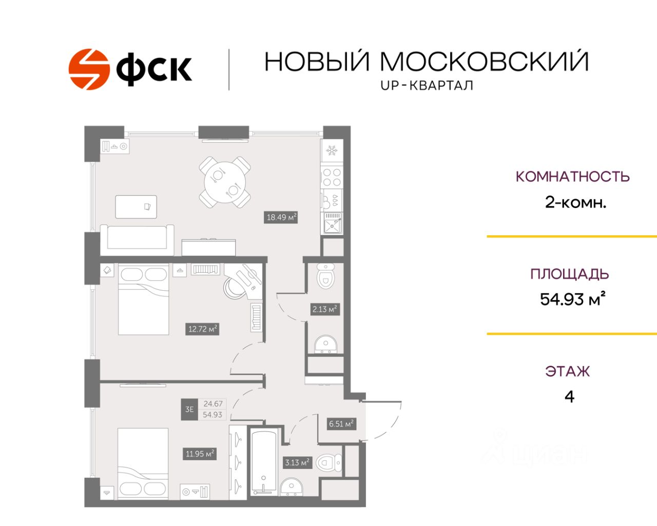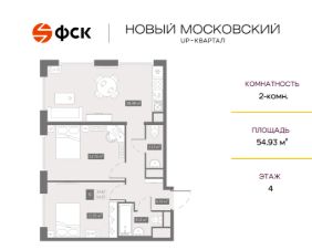 Прямая продажа от застройщика. Беспроцентная рассрочка. 2-к квартира в ЖК Квартал "Новый Московский" на 4-м этаже. Общая площадь 54,7. Без отделки.