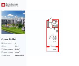 Удобная, классическая, функциональная европланировка, просторная прихожая 3.36 м². Общая площадь студии - 24.62 м², жилая 18.18 м², высота потолка 3.07 м.