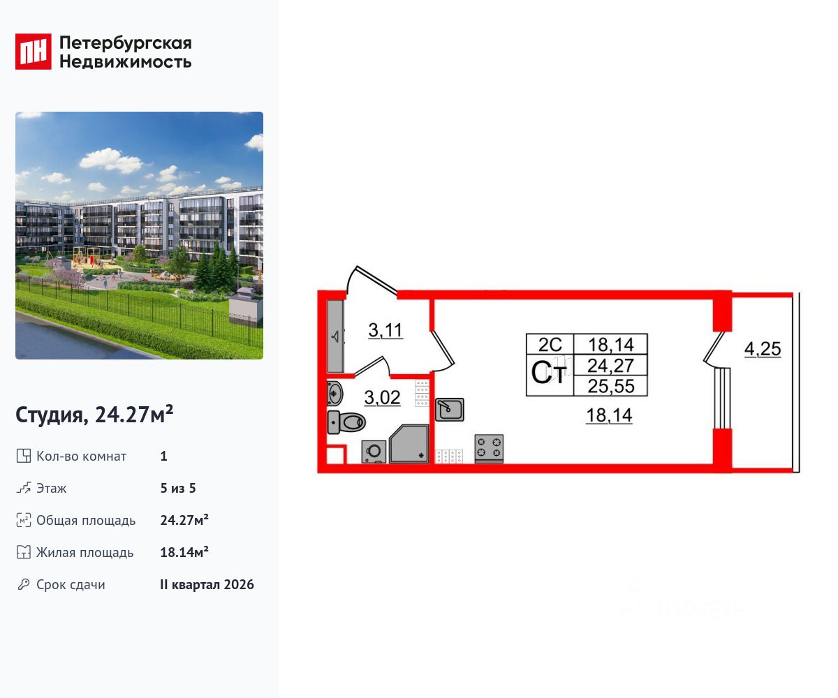 Удобная, классическая, функциональная европланировка, вместительная прихожая 3.11 м². Общая площадь студии - 24.27 м², жилая 18.14 м², высота потолка 3.07 м.
