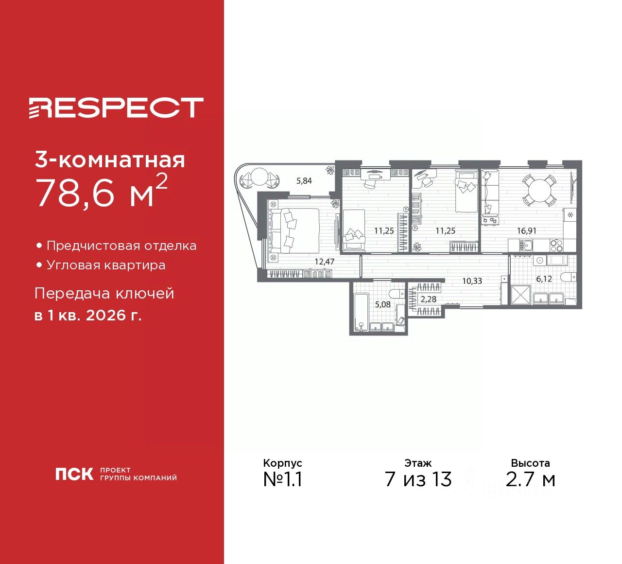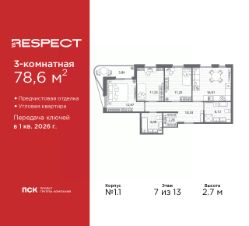 Трехкомнатная квартира с предчистовой отделкой в ЖК "RESPECT" на 7 этаже. Общая площадь: 78.6 кв.м., жилая: 34.97 кв.м., площадь просторной кухни-столовой: 16.91 кв.м. Квартира угловая, очень светлая, естественная вентиляция при открытии окон. В квартире один балкон, два совмещенных санузла. Наличие в квартире террасы дает возможность для обустройства дополнительной площади. Высота потолков 2.7 м.