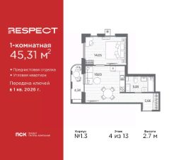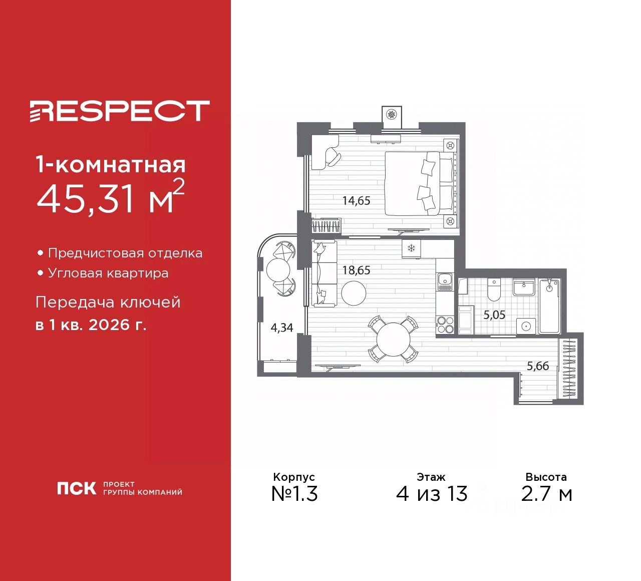 Просторная однокомнатная квартира с предчистовой отделкой в ЖК "RESPECT" на 4 этаже. Общая площадь: 45.31 кв.м., жилая: 14.65 кв.м., площадь просторной кухни-столовой: 18.65 кв.м. Угловая квартира, идеально подойдет любителям тишины и панорамных видов. В квартире один балкон, один совмещенный санузел. Высота потолков 2.7 м.
