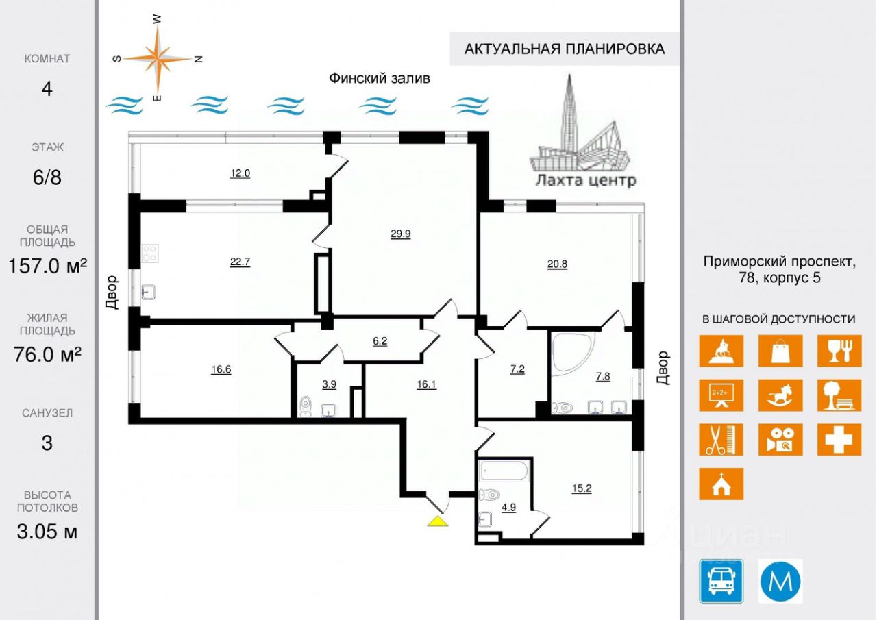4-х комнатные апартаменты общей площадью 157 кв.м. расположились на 6 этаже 8 этажного дома. Из окон открываются завораживающие виды на акваторию Финского залива и Лахта Центр, которые не оставят равнодушными даже самых требовательных и искушенных покупателей. Трехсторонняя планировка, высокие потолки, и панорамное остекление создают ощущение света, пространства, легкости и воздушности. В дневное время квартира буквально заливается светом. А закаты здесь просто потрясающие! Лучшие виды Петербурга прямо из окон Вашей квартиры! В нее невозможно не влюбиться!